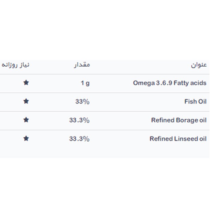 امگا 3-6-9ترکیبی از روغنهای ماهی ، کتان و گل گاو زبان است که طیف متعادلی از اسیدهای چرب موجود در ماهی و منابع گیاهی است. این ترکیب منبع غنی از اسیدهای چرب ضروری امگا 3 و امگا 6 و اسیدهای چرب مفید برای بدن یعنی امگا 9 می باشد. اسیدهای چرب برای عملکرد طبیعی سیتم ایمنی بدن ، حفظ سلامت پوست ، مو و ناخن ضروری هستند.اسیدهای چرب اجزا اصلی غشای سلولی بوده و بدون آنها غشاها قادر به عملیات فیزیولوژیک نمی باشند امگا 3 اسید های چرب EPA,DHA اسیدهای چرب ضروری هستند که نقش مهمی در عملکرد مغز دارد و به پیشگیری از بیماری های قلبی عروقی کمک می نماید. اسید چرب امگا 6 (اسید لینولئیک) نیز در ترکیب با اسیدهای چرب امگا بسیاری از خواص درمانی امگا 3 را دارا است. اما مهم ترین قسمت در مورد اسیدهای چرب گروههای عاملی آنها است که بهتر است مقدار مناسب مصرف شوند به طوری که نسبت امگا 6 به امگا 3 به نسبت 4 به 1 است. اسیدهای چرب امگا 6 در عملکرد سیستم تولید مثل ، آلرژیها ، تنظیم سوخت وساز بدن می توانند بسیار مفید یاشند. اسید چرب امگا 9 ، روغن غیراشباع مونو استئاریک اسید ، اسید چرب غیر ضروری است که به طور طبیعی توسط بدن در حضور امگا 3 و امگا 6 تولید می شود. در غیر این صورت آنها راباید مصرف نمود. این اسید چرب نقش مهمی در جلوگیری از بیماری قلبی با کاهش سطح کلسترول خون ایفا می کند. محتویات مغذی و اصلی روغن دانه کتان اسیدهای چرب ضروری امگا 3 :این اسیدهای چرب غیراشباع شده هستند که برای سلامت قلب بسیار مناسب میباشند.لیگناها:آنها دارای بیشترین خواص آنتی اکسیدانی هستند. کتان 8000 برابر بیشتر از سایر مشتقات گیاهی آنتی اکسیدان دارد. روغن گل گاوزبان به دلیل مقدار بالای اسید گاما لینولئیک اسید (GLA) دارای ارزش بالایی است. که این اسید چرب می تواند به کاهش التهاب وابسته به بسیاری از بیماری ها کمک کند. گاوزبان گیاهی گلدار و پر از اسیدهای چرب و آنتی اکسیدان ها است.