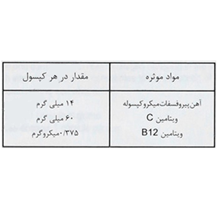 آهن یک نیاز ضروری بدن است که کمبود آن عوارض زیادی دارد و ویتامین C نیز در کنار خواص منحصربهفردی که دارد موجب تسهیل جذب آهن میشود و جذب آهن را به میزان دو برابر افزایش میدهد. همچنین ویتامین B12 موجود در این کپسول موجب تشکیل بهتر سلولهای خونی و جلوگیری از ضعف و خستگی میشود.