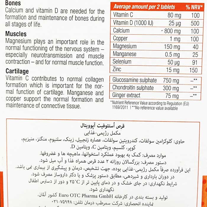 استئوفیت آپوویتال حاوی ترکیبی کاملاً متعادل از کلسیم ، ویتامین ها و مواد معدنی + گلوکوزامین ، کندرویتین و عصاره زنجبیل است.