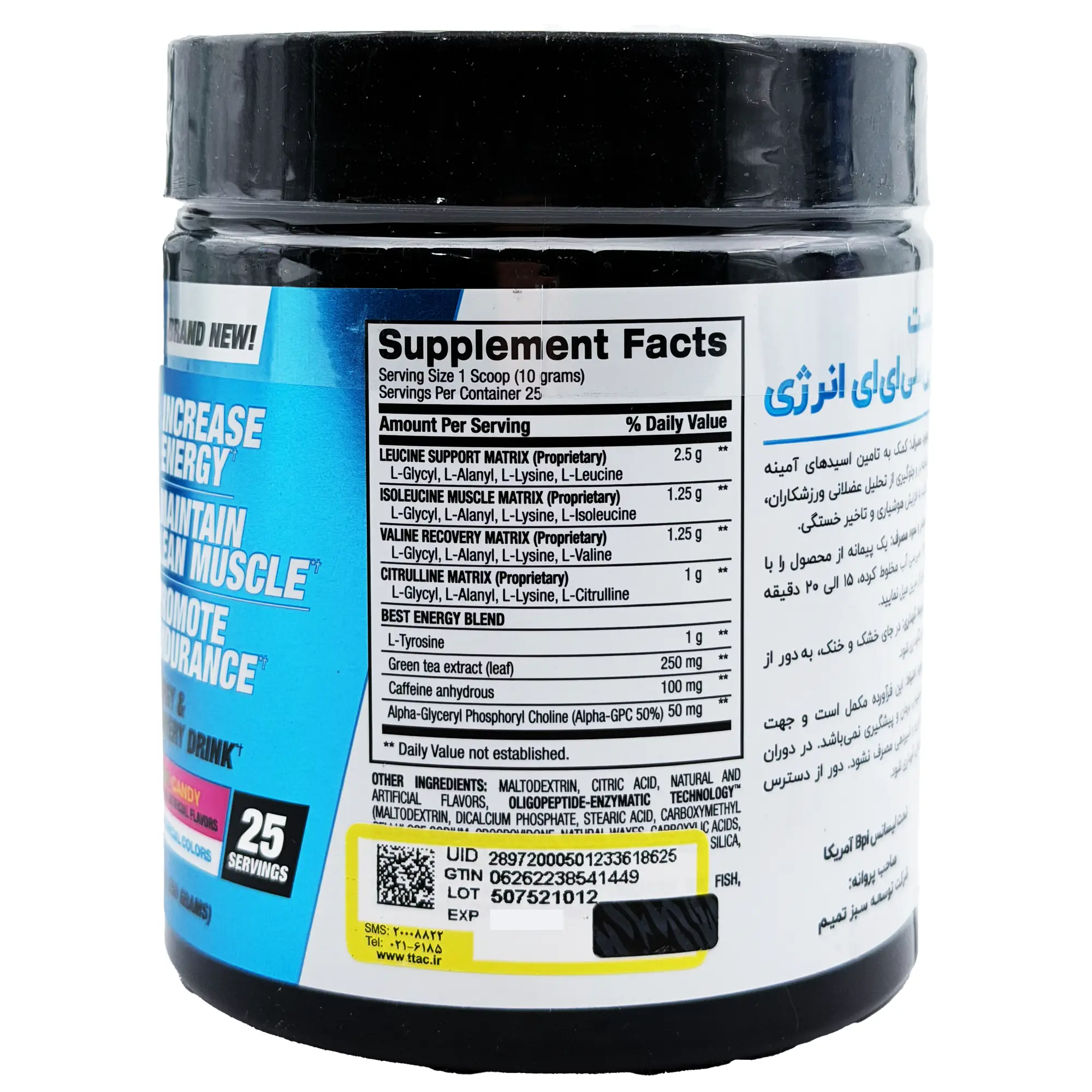 این فرمول آزمایششده و مطمئن حاوی لوسین، ایزولوسین و والین است تا به بهینهسازی ریکاوری عضلات شما کمک کند تا بتوانید هر روز سخت تر تمرین کنید. بی سی ای ای انرژی حاوی مواد کلیدی مانند کافئین و آلفا جیپیسی برای افزایش انرژی و بهبود شناخت ذهنی است. سطح کافئین معادل یک فنجان قهوه است که آن را برای یک میان وعده ظهر یا یک فرمول مؤثر قبل از تمرین عالی است.