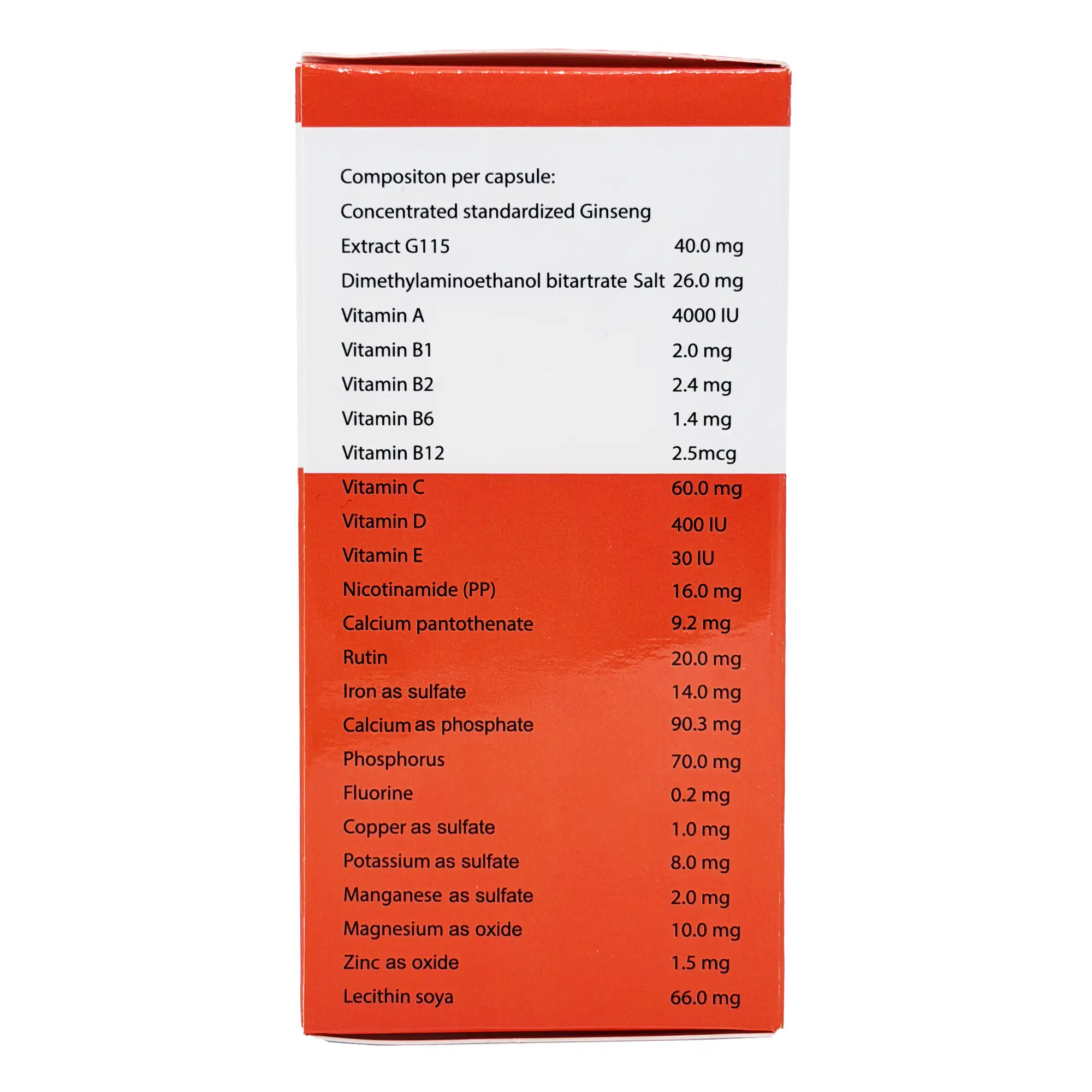 فرآورده موردنظر دارای عصاره جینسینگ با غلظت بالا، ویتامینها و عناصر کمیاب می باشد. از این رو جهت کمک در پیشگیری از کمبود ویتامین ها در بزرگسالان و افراد مسن به کار می رود. گیاه جینسینگ به عنوان عاملی جهت افزایش قوای ذهنی و جسمی در مواردی از قبیل ضعف، خستگی، کاهش تمرکز در طول دوره نقاهت به کار می رود.