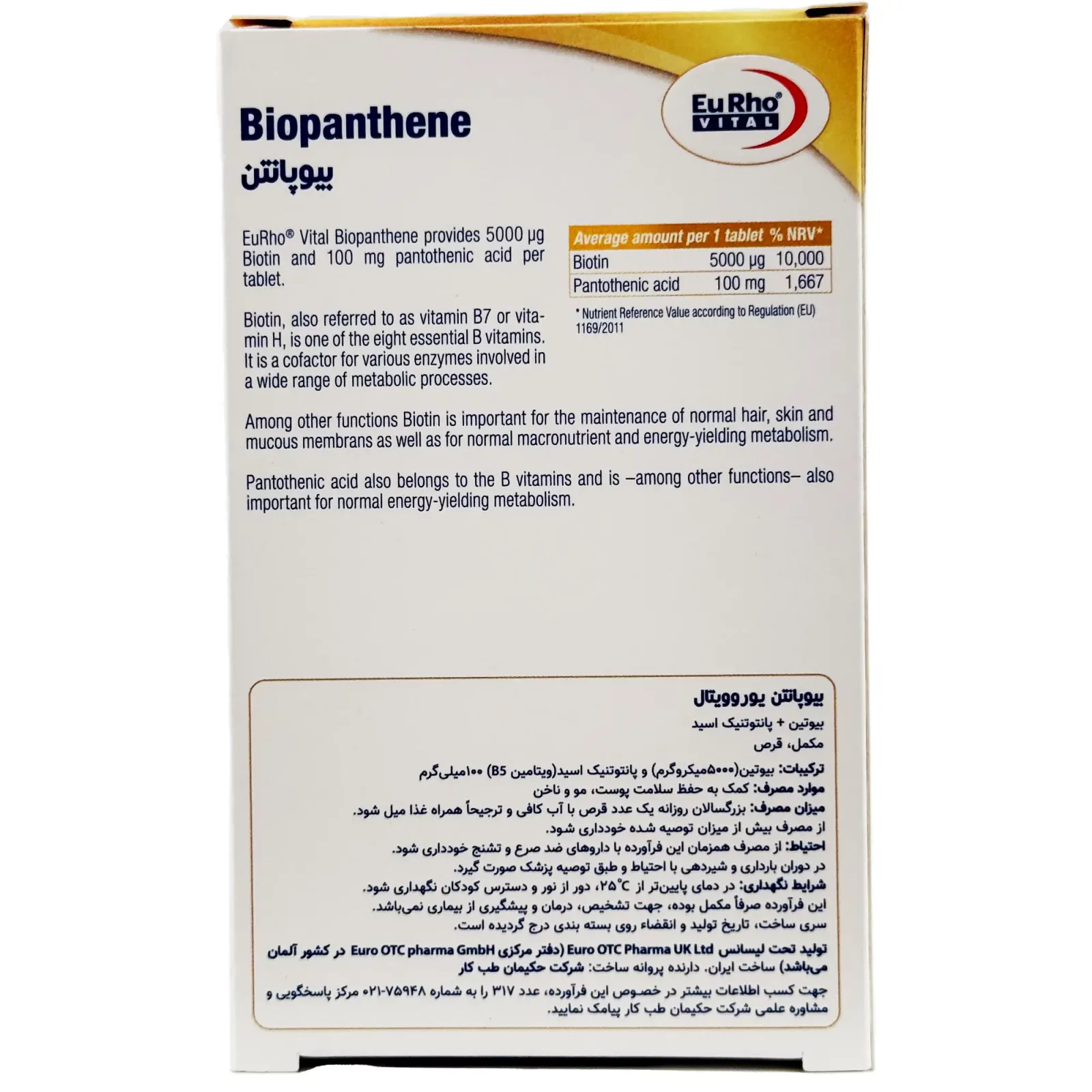 حاوی 5000 میکروگرم بیوتین (B7) و 100 میلیگرم پانتوتنیک اسید (B5)
