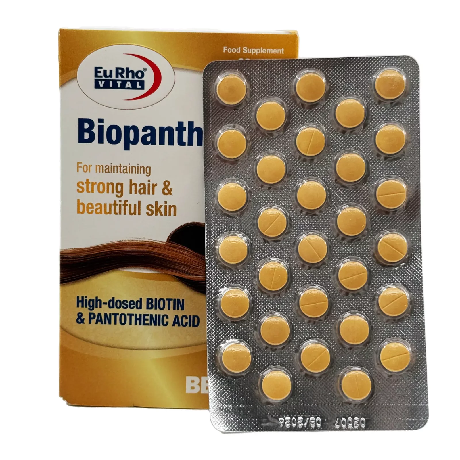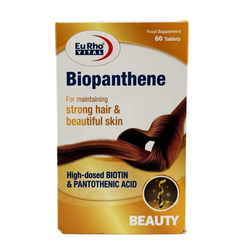 قرص بیوپانتن یوروویتال حاوی 5000 میکروگرم بیوتین و 100 میلیگرم پانتوتنیک اسید، تامین کننده دوز بالای بیوتین و پانتوتنیک اسید است که به پرپشت شدن موها، احیای پوست و سفتی ناخنها کمک میکند.