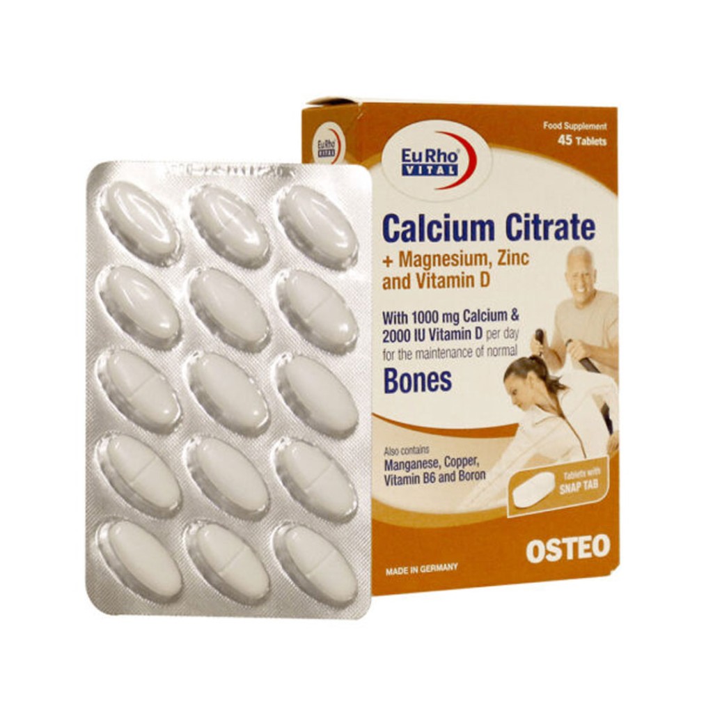 قرص کلسیم سیترات یوروویتال حاوی کلسیم سیترات، ویتامینD، منیزیم، روی، منگنز، مس، ویتامین B6 و بور، مکملی مناسب جهت پیشگیری و کمک به درمان پوکی استخوان است.