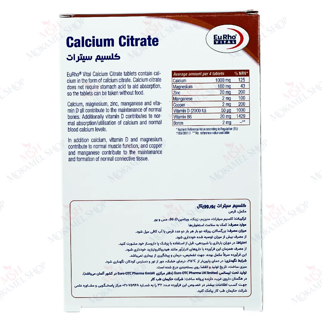 حاوی کلسیم سیترات، ویتامین D، منیزیم، روی، منگنز، مس، ویتامین B6 و بور