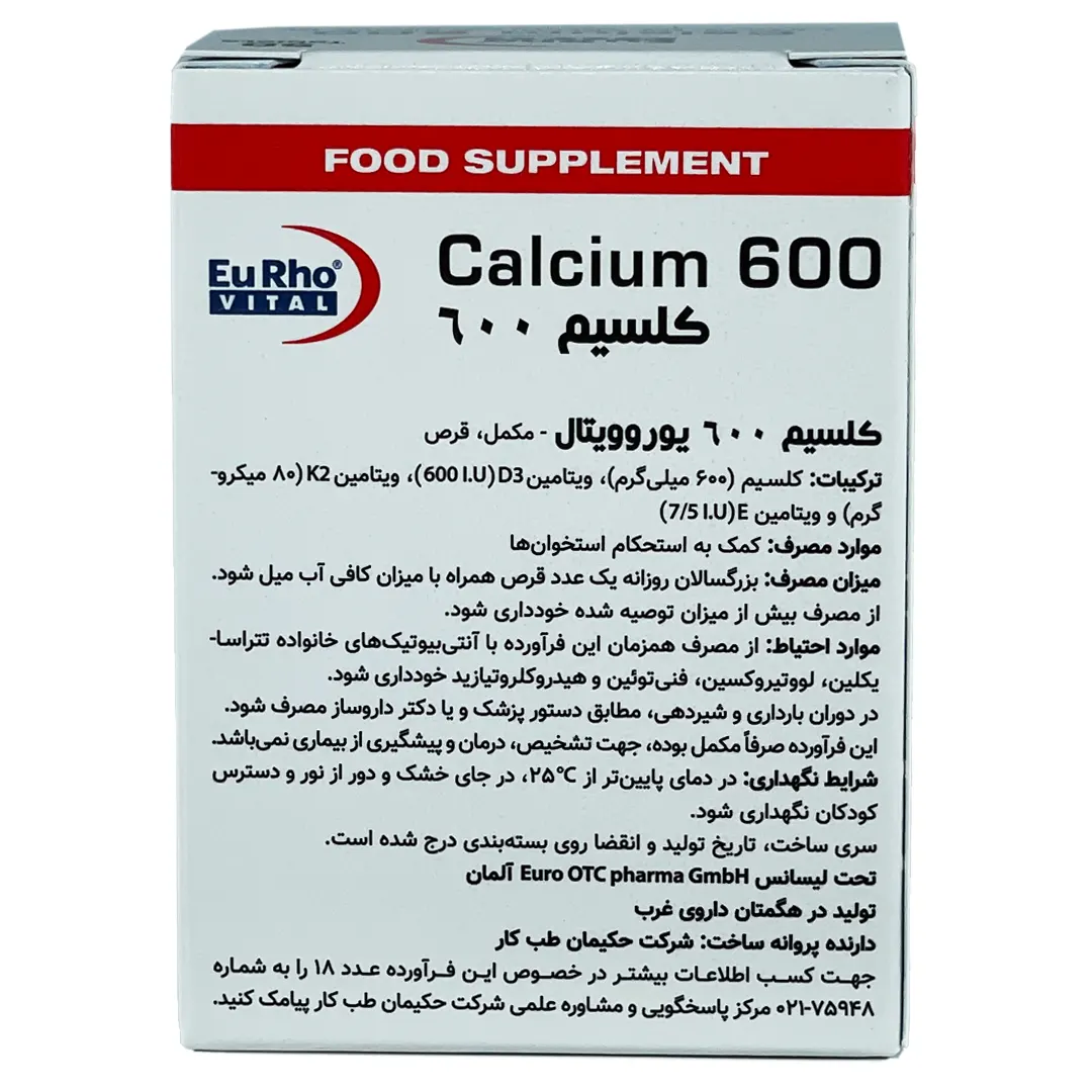 قرص کلسیم 600 + ویتامین D یوروویتال حاوی 600 mg کلسیم و ویتامینهای D3، E و K2، به حفظ سلامت استخوانها کمک مینماید. این مکمل در افراد مبتلا به پوکی استخوان و تمام افرادی که در معرض خطر این بیماری قرار دارند توصیه میشود. زنان (بهویژه بعد از یائسگی) بیشتر از مردان مستعد پوکی استخوان هستند.