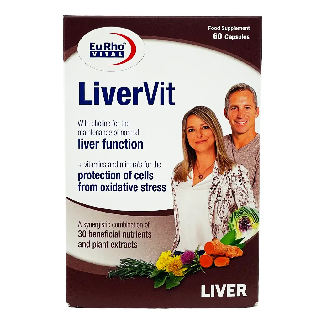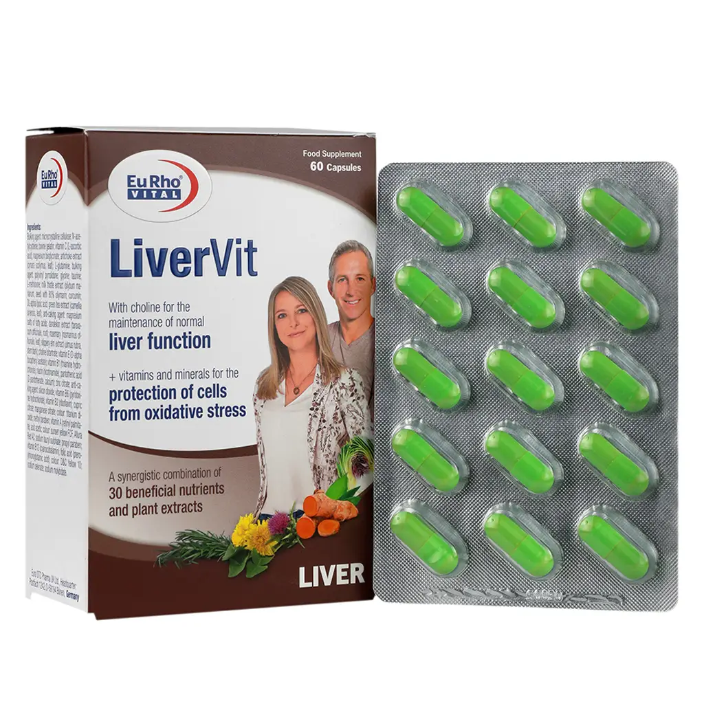 کپسول لیورویت یوروویتال حاوی ترکیبات گیاهی، ویتامینها و مواد معدنی مورد نیاز برای سلامت کبد و کمک درمان کبد چرب است.