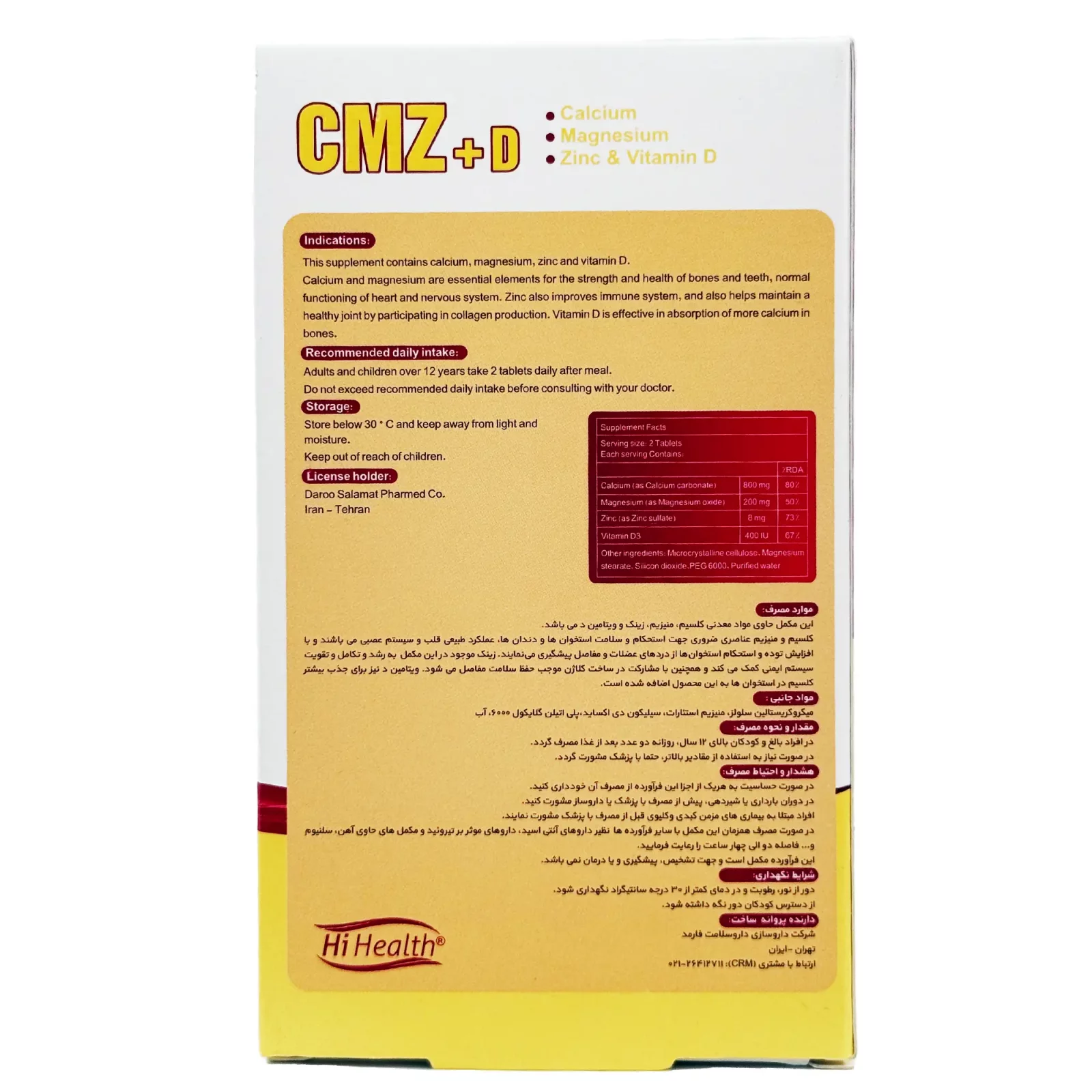 کلسیم منیزیم زینک پلاس ویتامین دی های هلث، حاوی کلسیم به فرم کربنات، منیزیم، زینک و ویتامین D