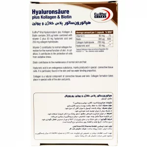 کپسول هیالورون سائور پلاس یوروویتال حاوی هیالورونیکاسید، کلاژن، بیوتین و ویتامین C مکملی کامل و مناسب جهت حفظ سلامت پوست، مو و ناخنها میباشد.