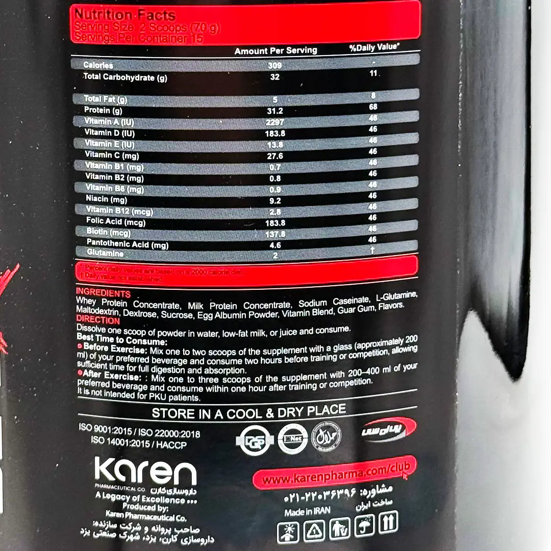 برای گرفتن بهترین نتیجه در افزایش وزن و حجم عضلات و جلوگیری از خستگی و تحلیل عضلانی، در روزهای تمرین 3-2 پیمانه را تا 3 ساعت پیش از تمرین و 3-2 پیمانه را تا یک ساعت پس از تمرین میل نمایید.