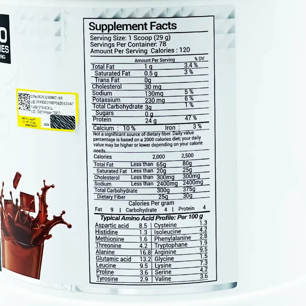 حاوی ۲۴ گرم پروتئین وی در هر پیمانه ۲۹ گرمی