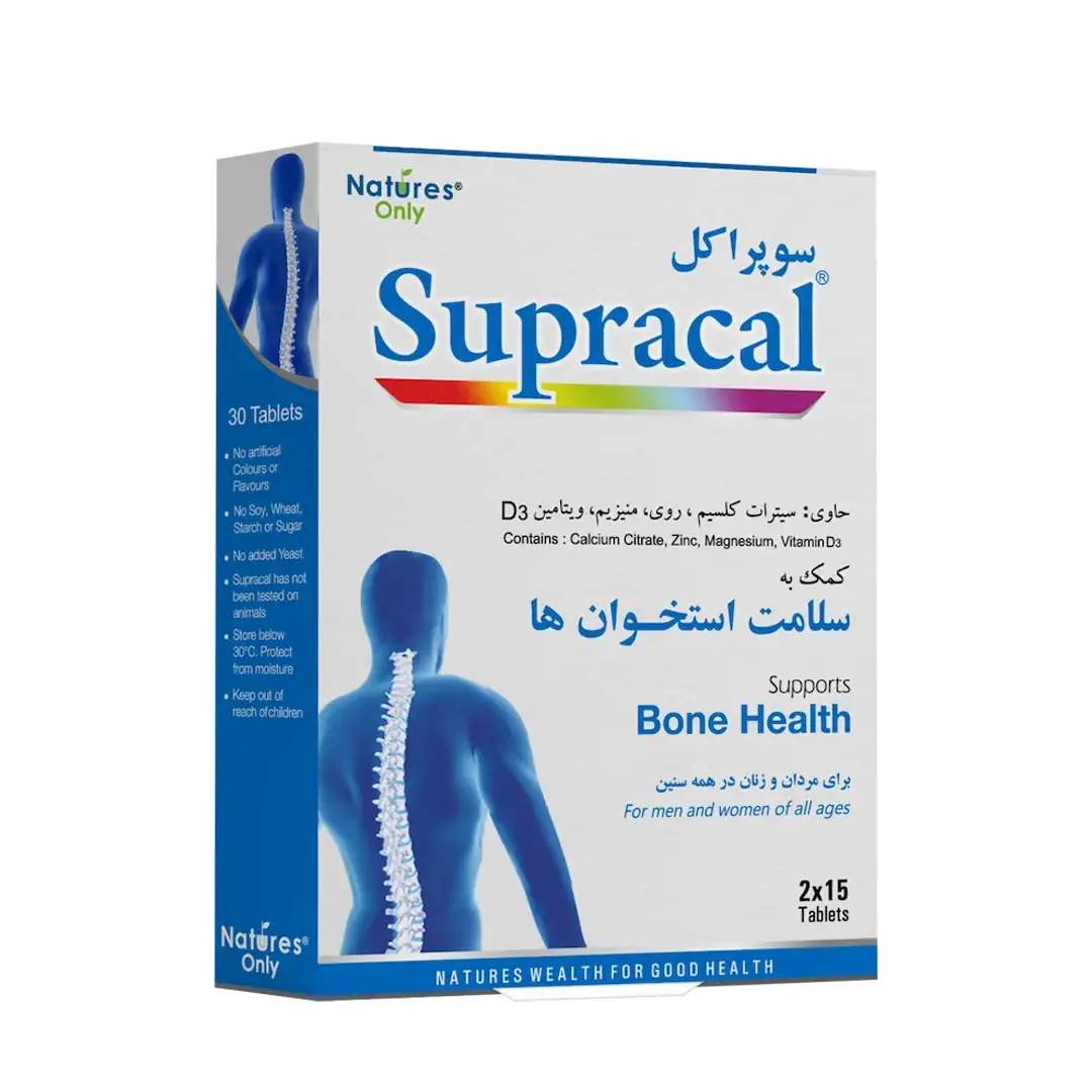 قرص سوپراکل نیچرز انلی یک مکمل غذایی غنی شده با مواد مغذی حیاتی برای سلامت استخوان است. سوپراکل حاوی سیترات کلسیم و یک فرم ترجیحی از ویتامین D3 به شکل فعال آن است.