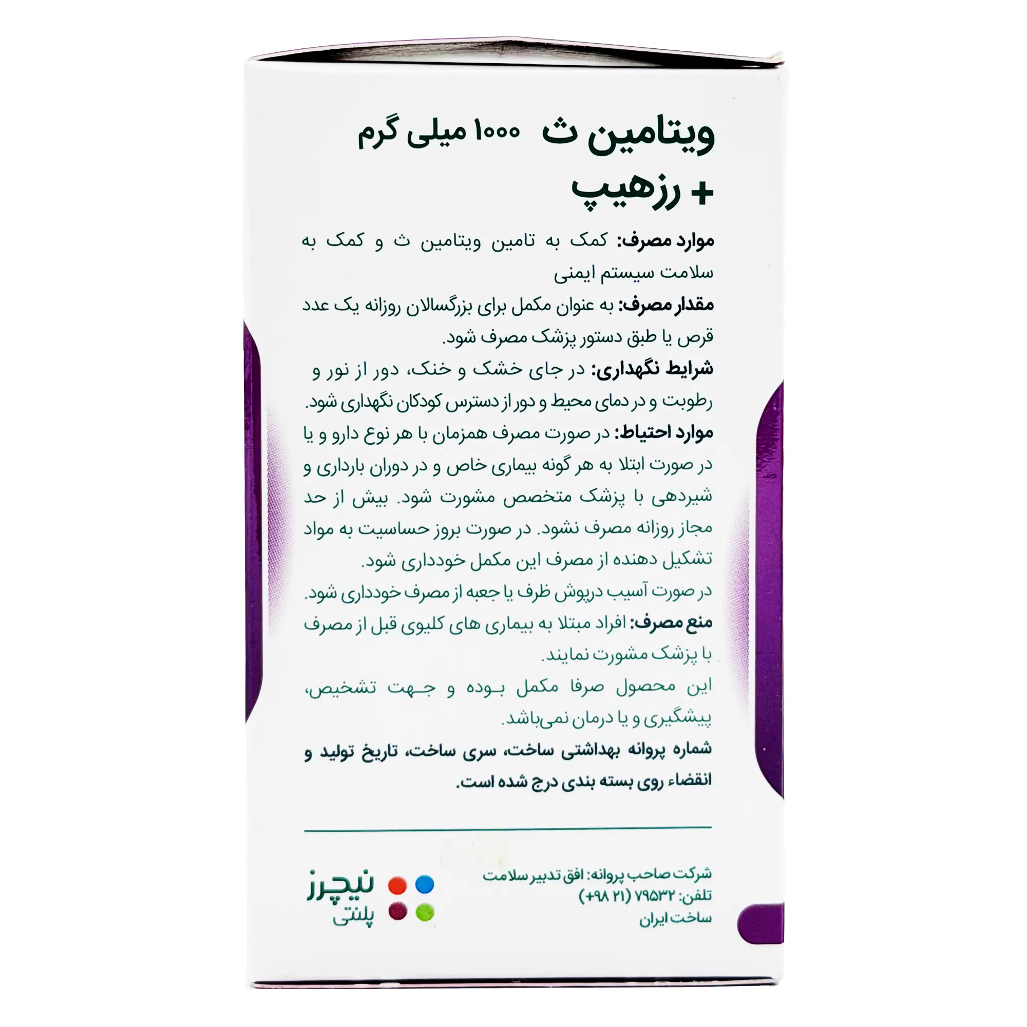 حاوی 1000 میلی گرم ویتامین ث و 105 میلی گرم رز هیپ در هر قرص