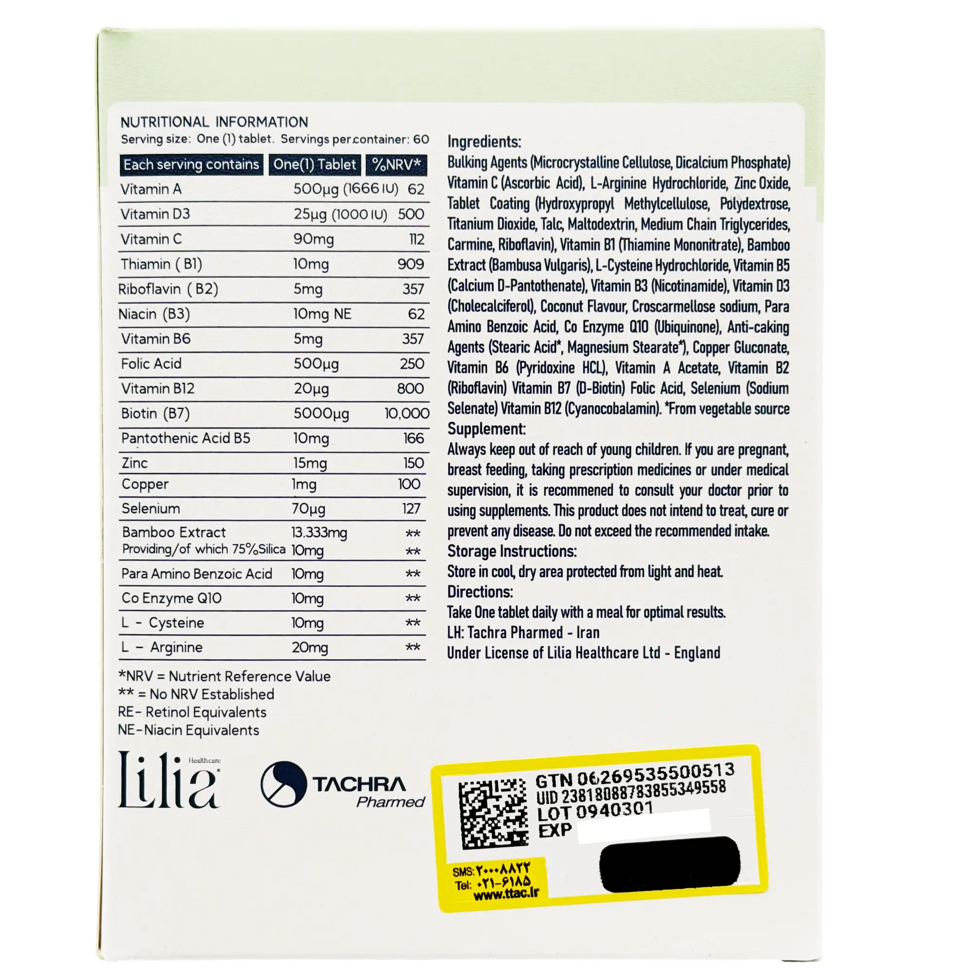 * فرمول قدرتمند غنی شده با سیلیس، PABa، Co Q10، L-سیستئین و L-آرژنین، همراه با 5000 میکروگرم بیوتین.