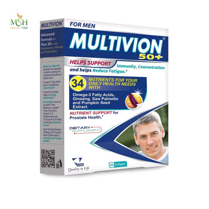 +Multivion Men 50 برای مردان بالای 50 سال شخصی است و دارای 34 ماده مغذی برای نیازهای روزمره سلامتی با اسیدهای چرب امگا 3 ، جینسینگ ، عصاره کدو تنبل است.