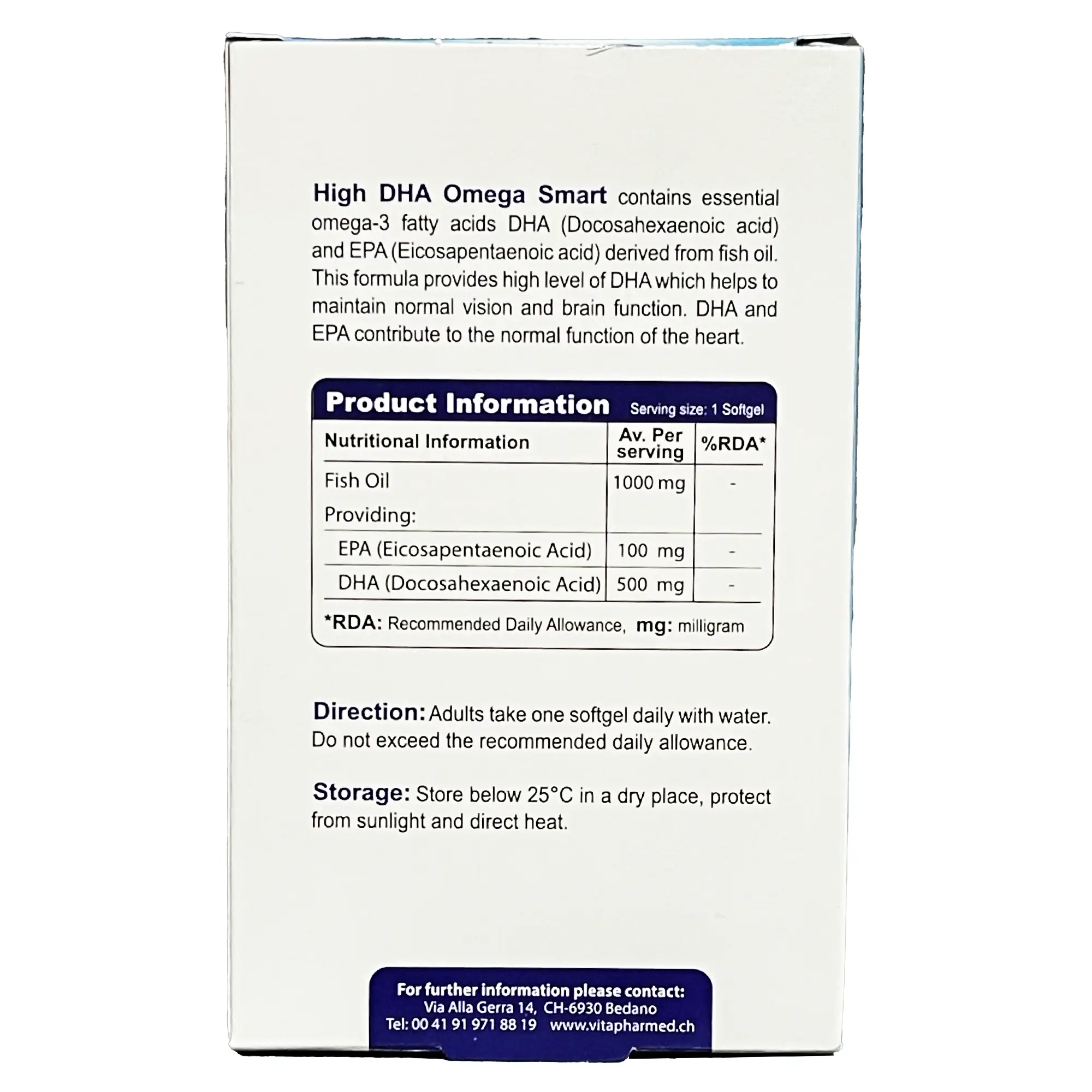 هر کپسول امگا ۳ DHA بالا شامل ۱۰۰۰ میلیگرم روغن ماهی است که حاوی ۵۰۰ میلیگرم DHA و 100 میلیگرم EPA است.