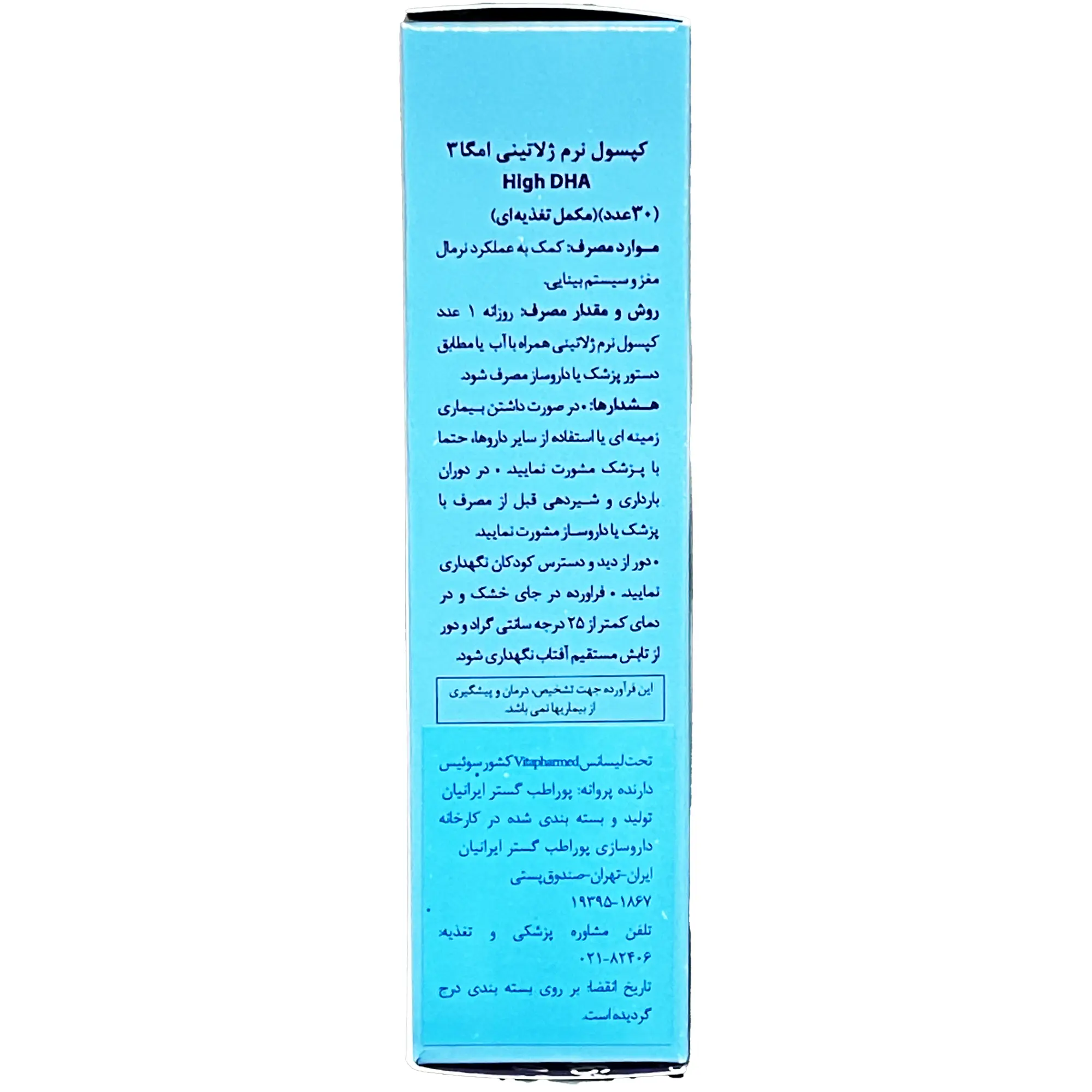 این فرآورده تحت لیسانس شرکت Vitapharmed کشور سوئیس، با پروانه ساخت شرکت پوراطب گستر ایرانیان، در کارخانه داروسازی پوراطب گستر ایرانیان در ایران تولید و در جعبه مقوایی 30 عددی شامل 2 بلیستر 15 تایی به فرم دارویی سافت ژل عرضه شده است.